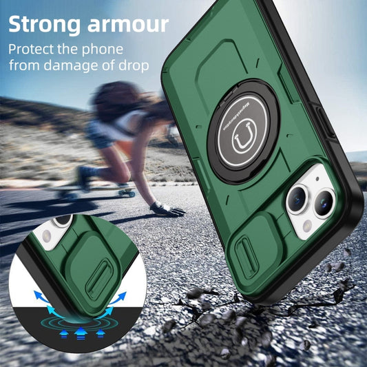 For iPhone 14 Plus Sliding Camshield TPU Hybrid PC Magnetic Holder Phone Case(Dark Green)