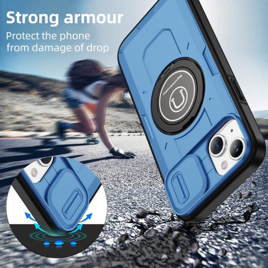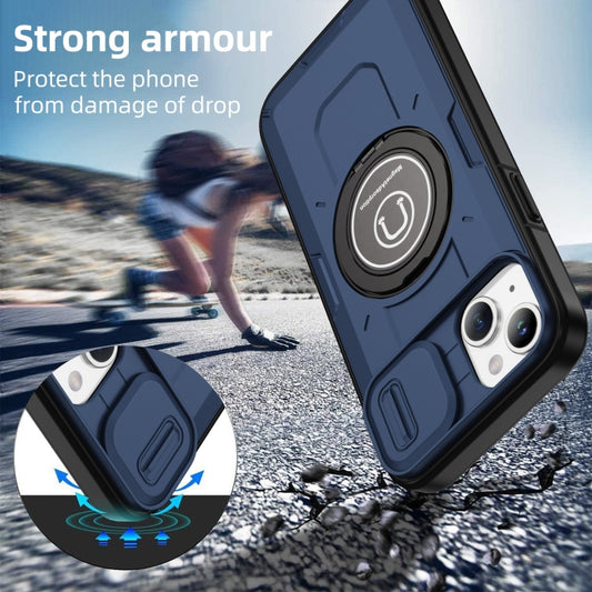 For iPhone 14 Plus Sliding Camshield TPU Hybrid PC Magnetic Holder Phone Case(Dark Blue)