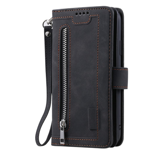 For iPhone 15 Pro Nine Card Zipper Bag Leather Phone Case with Lanyard(Black)