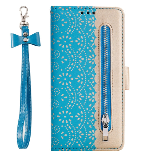 For iPhone 15 Pro Lace Pattern Double Button Zipper Leather Phone Case with Lanyard(Blue)