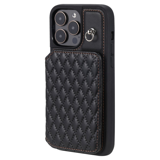 For iPhone 15 Pro Grid Texture Card Bag Phone Case with Lanyard(Black)