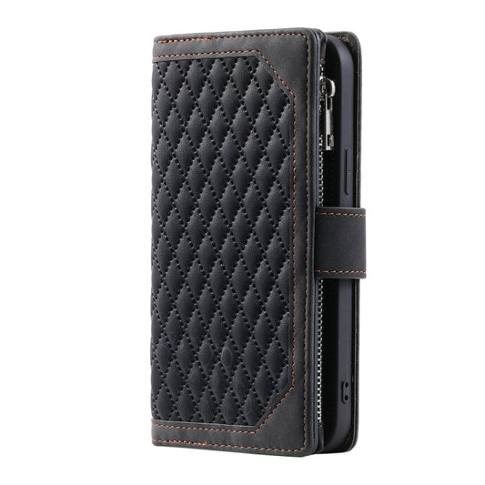 For iPhone 15 Pro Grid Texture Zipper Leather Phone Case with Lanyard(Black)