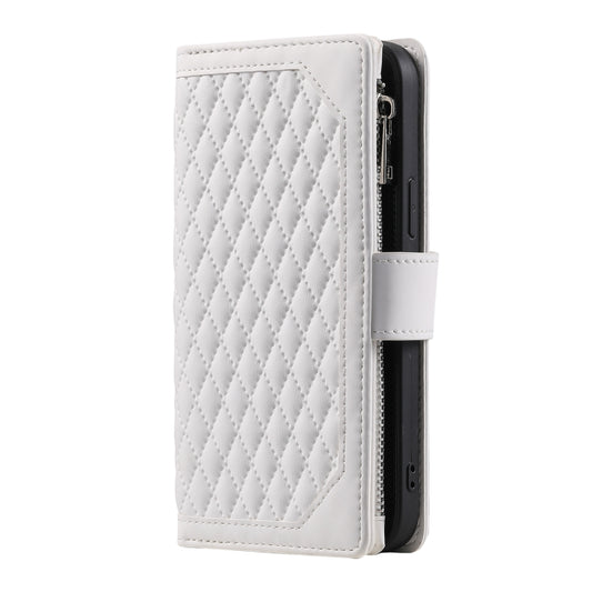 For iPhone 15 Pro Grid Texture Zipper Leather Phone Case with Lanyard(White)