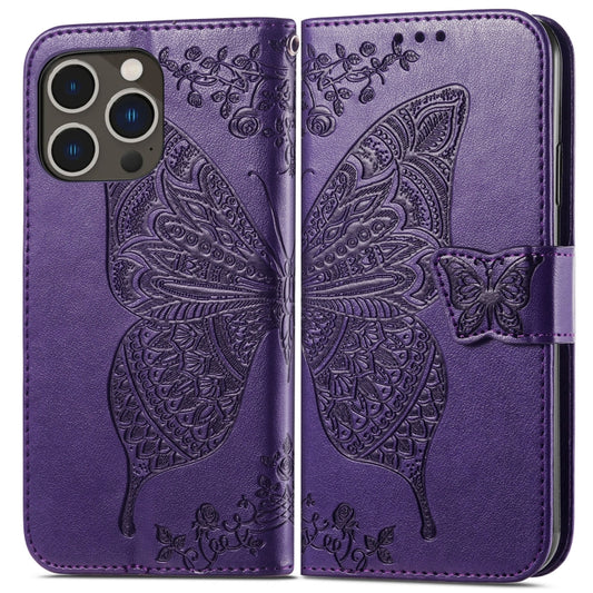 For iPhone 15 Pro Butterfly Love Flower Embossed Leather Phone Case(Dark Purple)