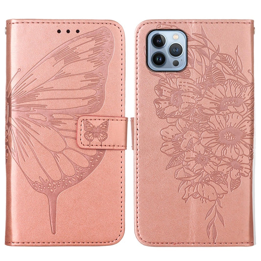 For iPhone 15 Pro Embossed Butterfly Leather Phone Case(Rose Gold)