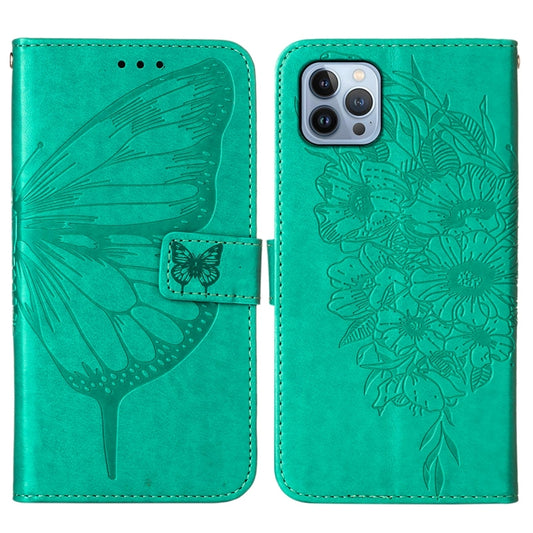 For iPhone 15 Pro Embossed Butterfly Leather Phone Case(Green)