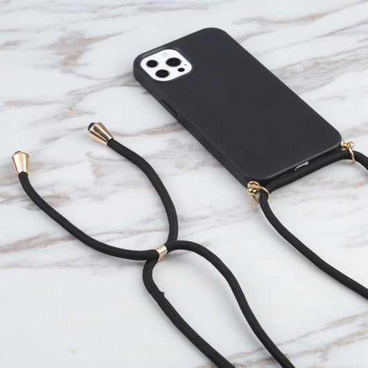 For iPhone 15 Pro Wheat Straw TPU Shockproof Phone Case with Neck Lanyard(Black)