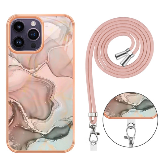 For iPhone 15 Pro Electroplating Marble Dual-side IMD Phone Case with Lanyard(Rose Gold 015)