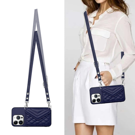 For iPhone 16 Pro Rhombic Texture Card Bag RFID Phone Case with Long Lanyard(Blue)