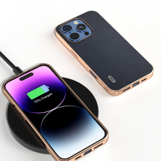 For iPhone 16 Pro ABEEL Electroplated Frame Genuine Leather Elegant Phone Case(Blue)