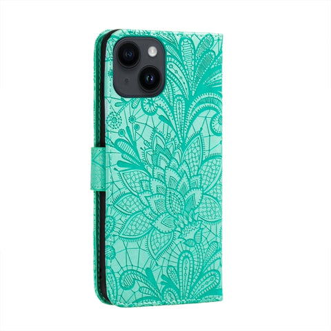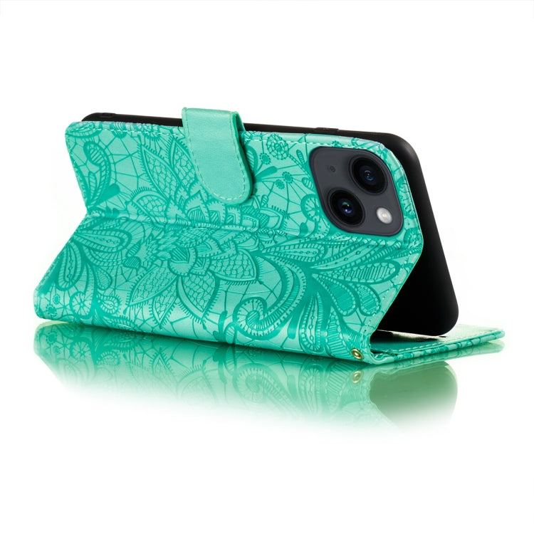 For iPhone 14 / 13 Lace Flower Embossing Flip Leather Phone Case(Green)