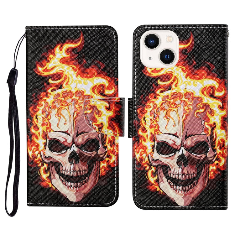 For iPhone 14 3D Colored Drawing Flip Leather Phone Case (Flame Skull)