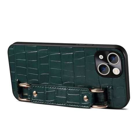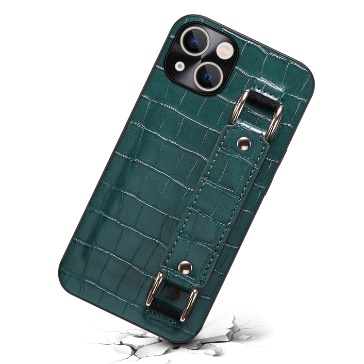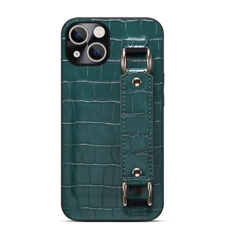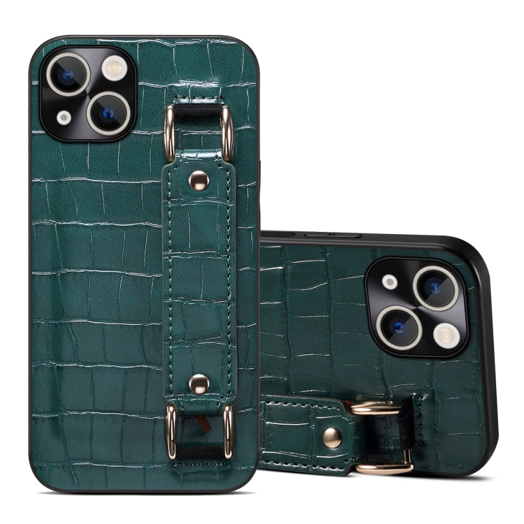 For iPhone 14 Crocodile Wristband Wallet Leather Back Cover Phone Case(Dark Green)