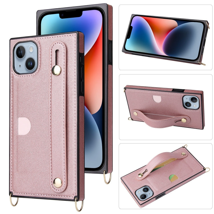 For iPhone 14 Crossbody Lanyard Shockproof Protective Phone Case (Rose Gold)