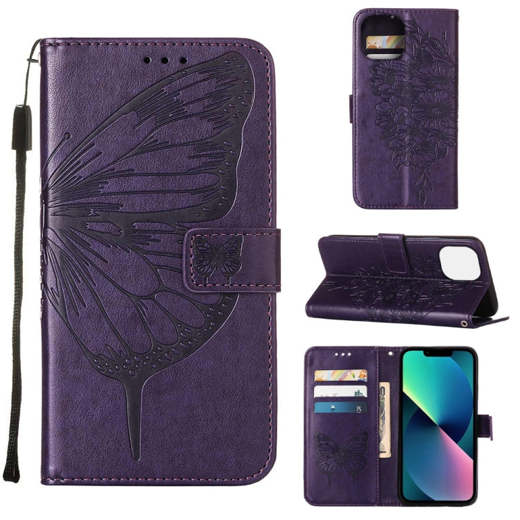 For iPhone 14 Embossed Butterfly Leather Phone Case (Dark Purple)