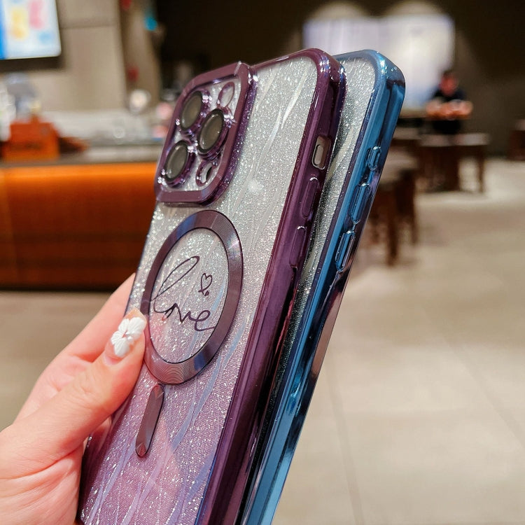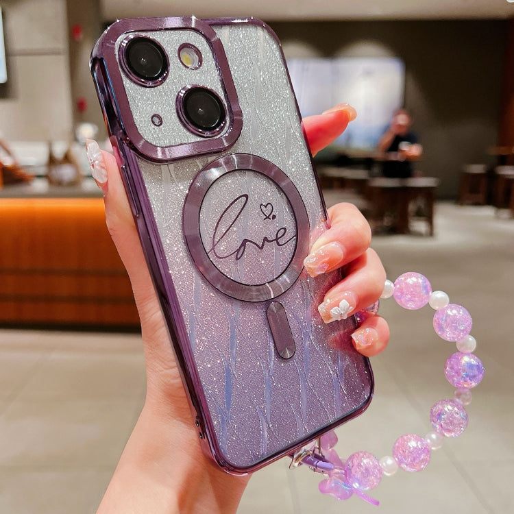 For iPhone 14 Plus Dual-Love Leaves Gradient Glitter Bracelets Magsafe TPU Phone Case(Purple)
