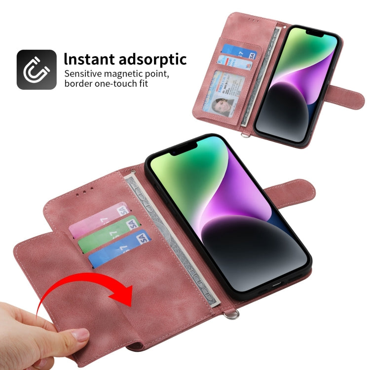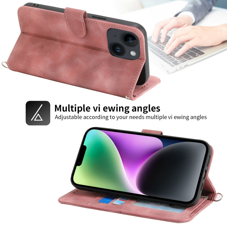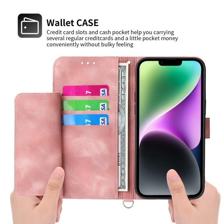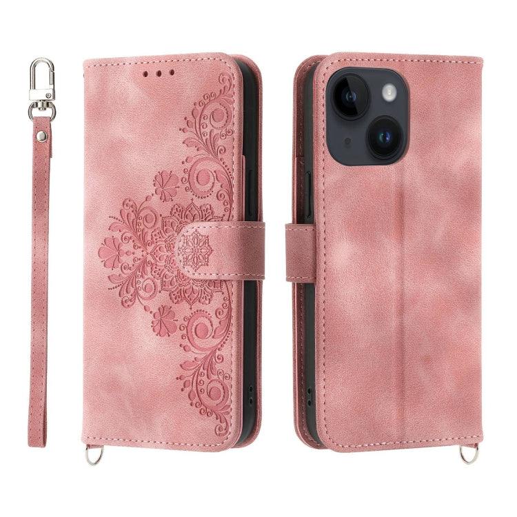For iPhone 14 Skin-feel Flowers Embossed Wallet Leather Phone Case(Pink)