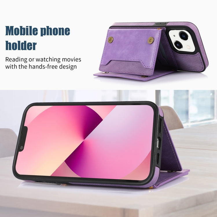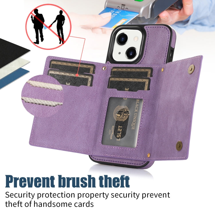 For iPhone 14 Three-fold RFID Leather Phone Case with Lanyard(Purple)
