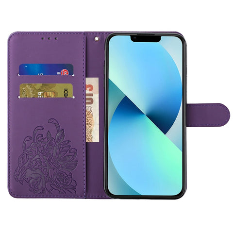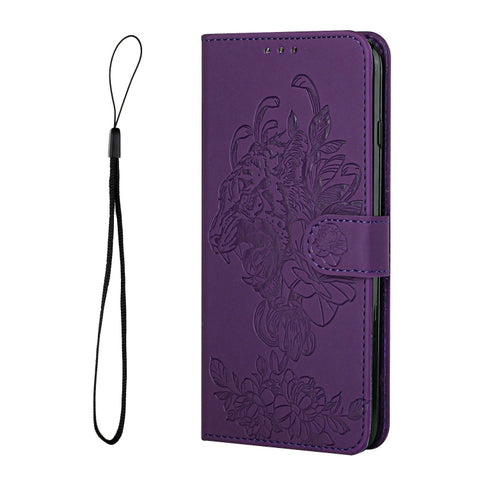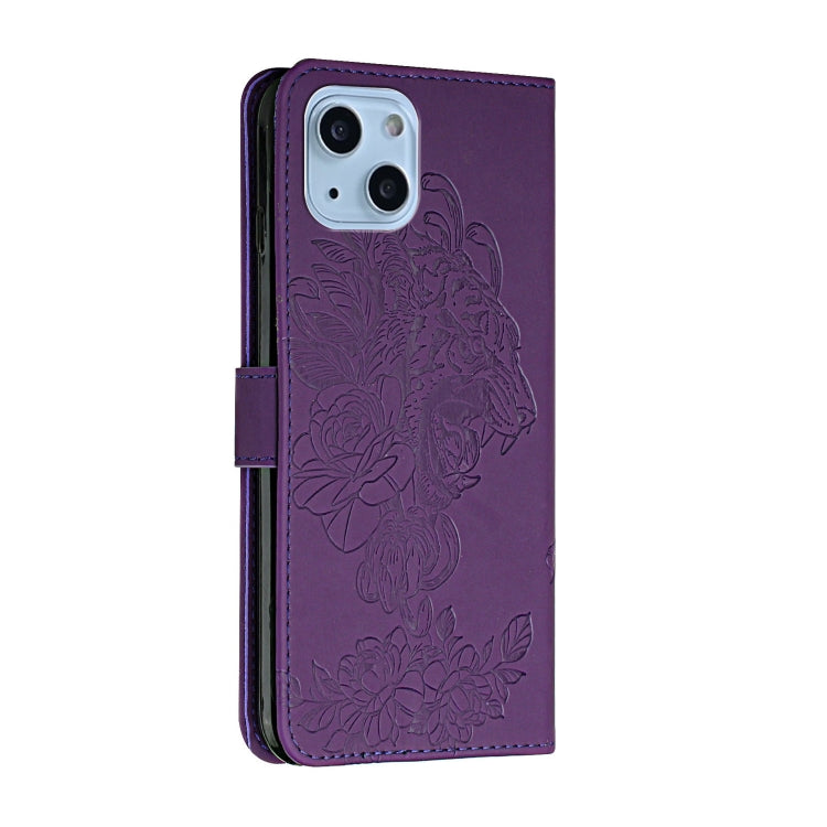 For iPhone 14 Tiger Flower Embossing Leather Phone Case (Purple)