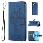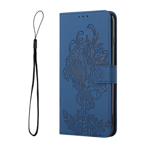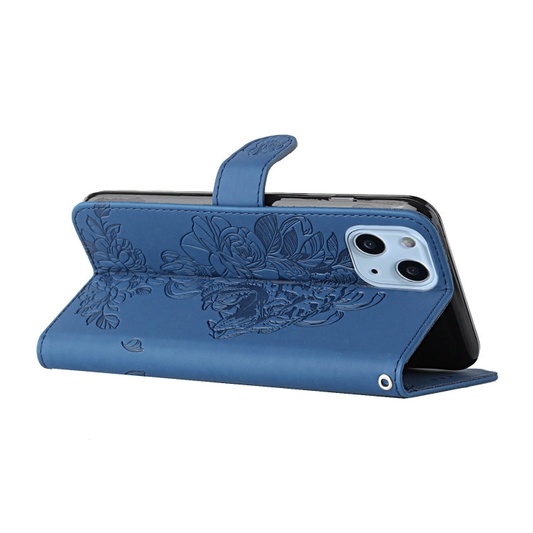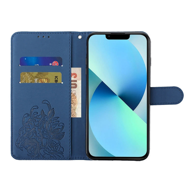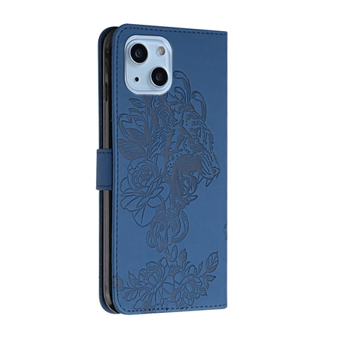 For iPhone 14 Tiger Flower Embossing Leather Phone Case (Royal Blue)